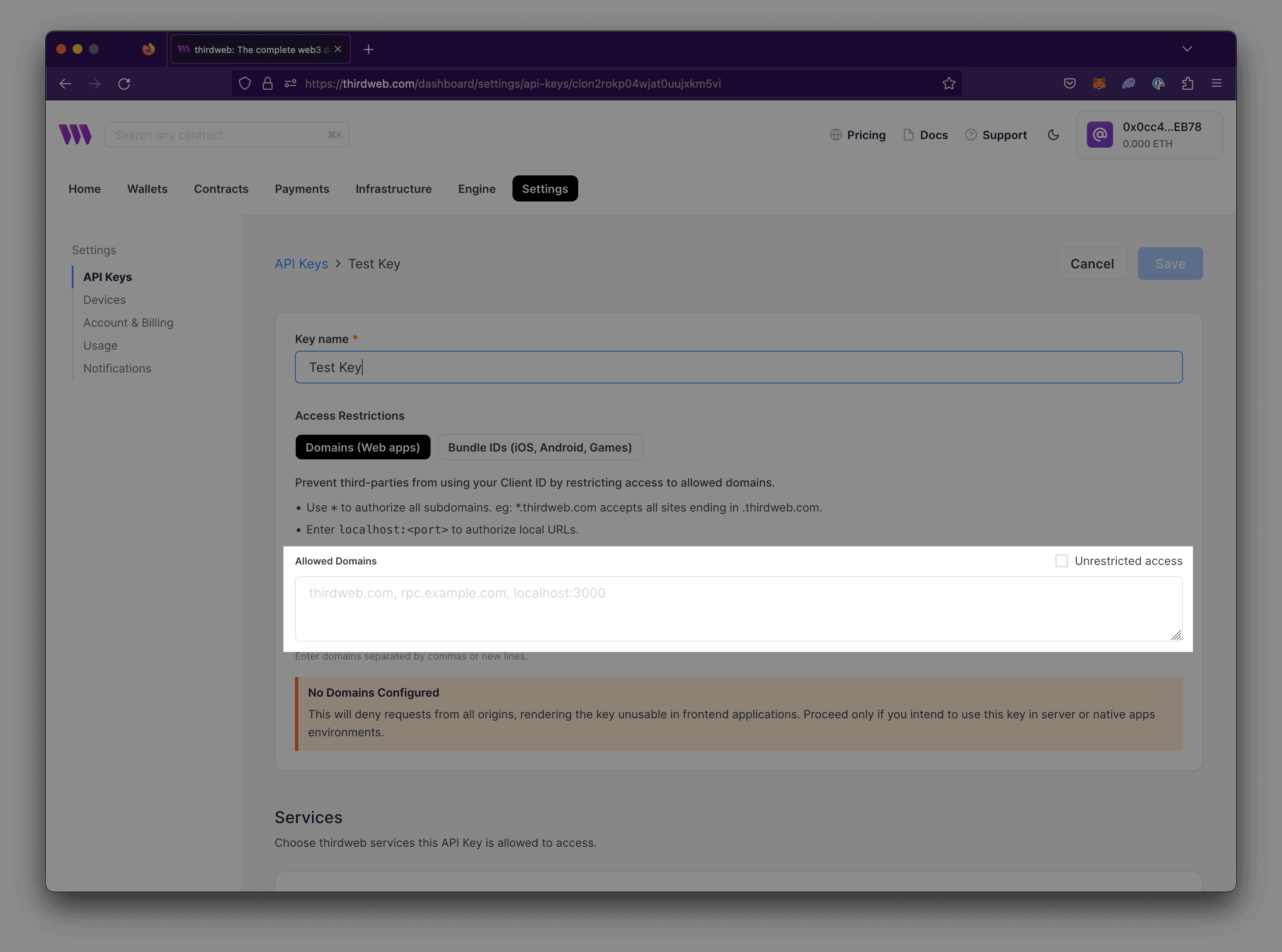 - Domain IDs: A domain ID is used to restrict access to the enabled thirdweb infrastructure services based on a specific domain. It serves as an identifier for websites.