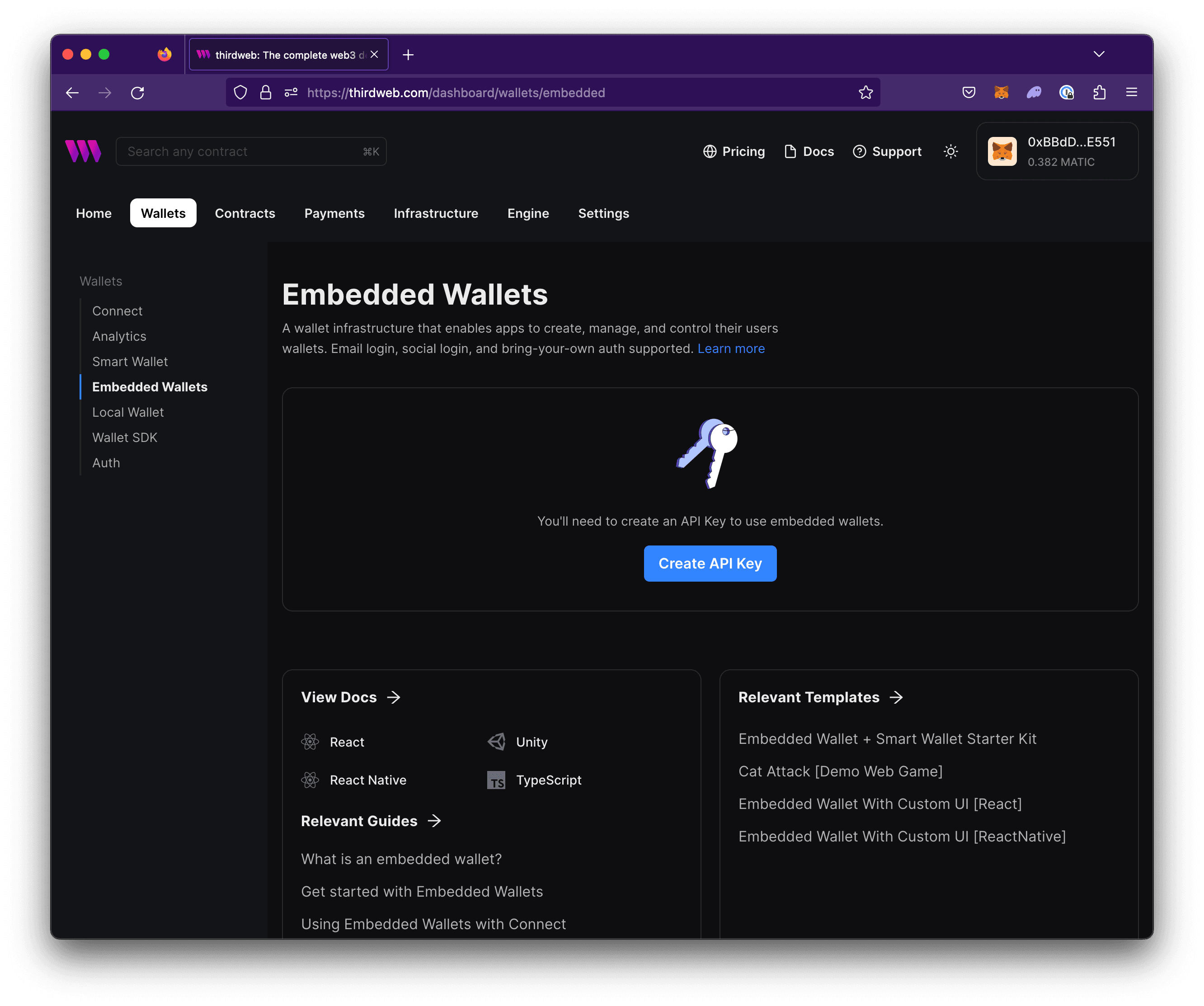 Create a thirdweb API key if you don't have one or select an existing key to use for this project. Learn more about API keys.