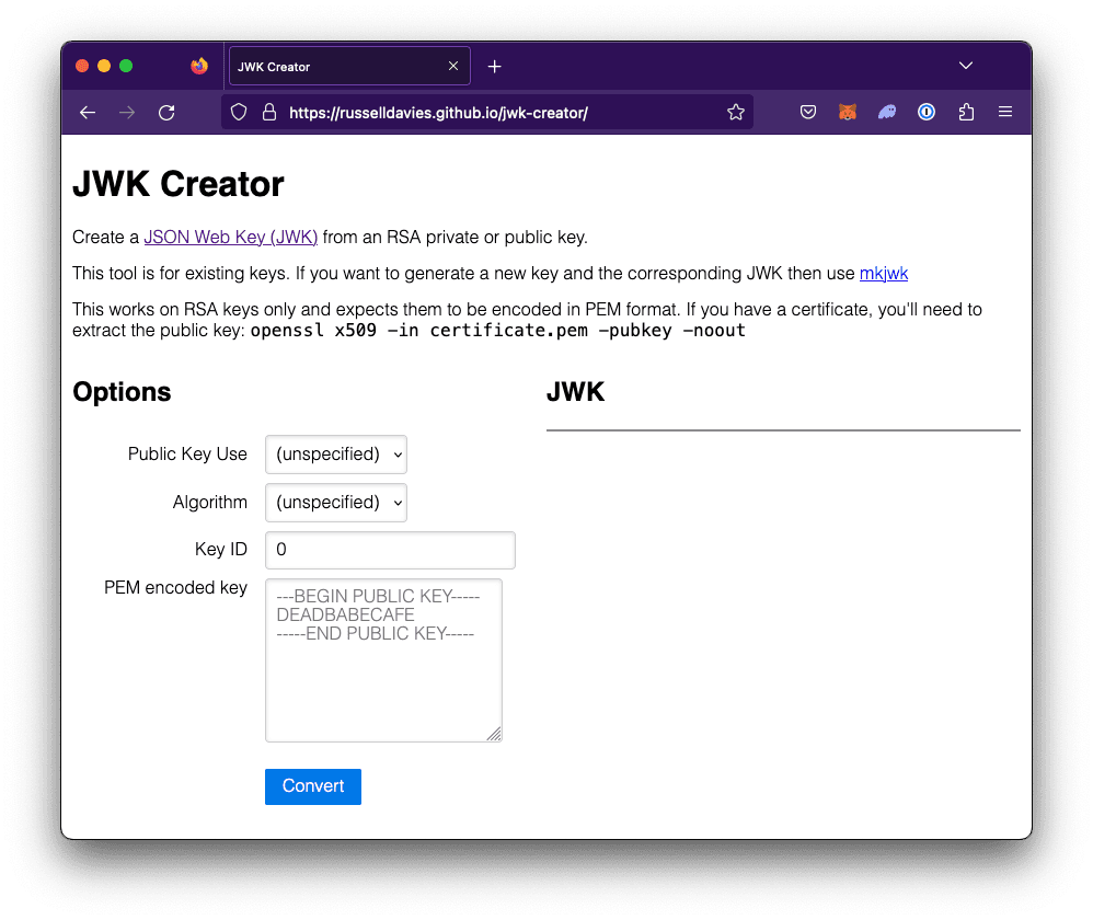 Convert your public key to a JWK using an online JWK Creator tool. We recommend using JWK Creator by Russel Davies.