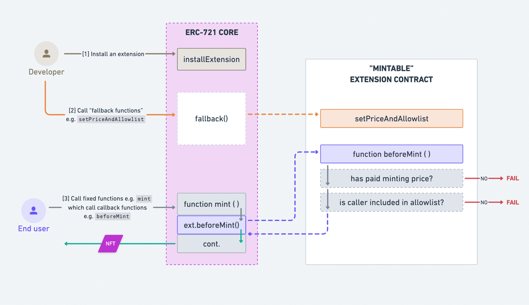 Various minting and burning mechanisms, token metadata formats, soulbound capabilities, etc. can all be implemented as independent Extension smart contracts which can be plugged into a developer’s ERC-721 Core contract.